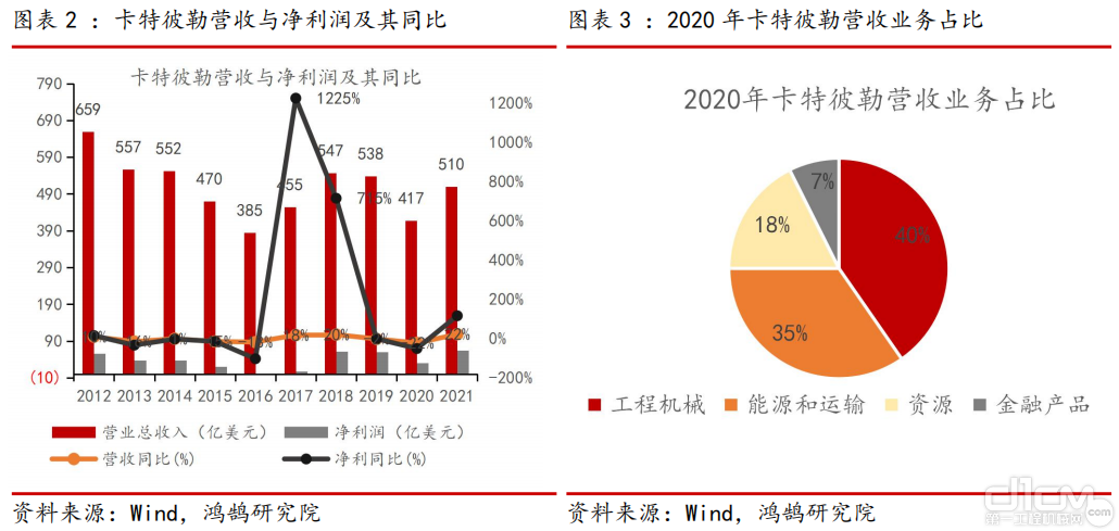 净利润与营业收入回升。2020年扣非归母净利润为28.98亿美元,同比下降50.80%;2021年扣非归母净利润为64.89亿美元,同比增长116.44%。卡特彼勒2016-2020年的营收呈倒挂趋势,2018年营收触顶后回落,年复合增长率为0.47%。2020年营收为417亿美元,同比下降22.40%。2020年,最终用户需求的降低和经销商库存的变化导致销售额下降,其中建筑业最终用户需求主要受北美建筑活动减弱的推动。2021年全年销售和收入为510亿美元,较2020年417亿美元增长了22%。该增长反映出终端用户对设备和服务需求量的增加,以及代理商库存变化带来的影响。卡特彼勒分为四个主要的业务部门为工程机械、能源和运输业、资源业和金融。2020年工程机械、能源和运输业、资源业和金融产品四大板块营收占比分别约 40%、35%、18%和7%。