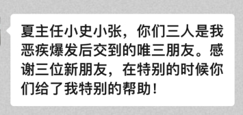 随着病情变化,3 月初,张老师转院至家乡龙泉市人民医院。在夏主任的牵头带领、社工师的组织与联动下,省、市、县三级医院联动召开照护讨论会,医护社团队全程跟进,确保服务的连续性。在医护社联合团队的专业守护下,在家人和学生的温情环绕中,张老师的“整体性疼痛”得到了有效缓解,内心的焦虑和恐惧逐渐消退,取而代之的是平和与宁静。面对一直悉心照料和陪伴他的医护社团队,他表达了最真挚的感激:“你们是我恶疾爆发后交到的‘唯三’朋友,感谢在特别的时候你们给了我特别的帮助!”