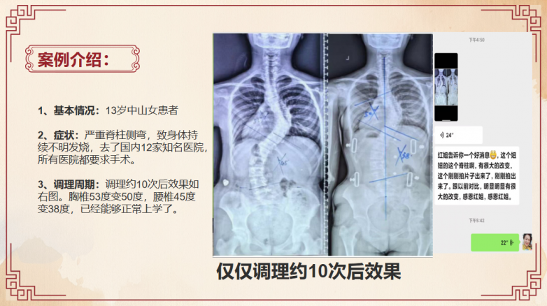 中漫英太医的 “脊柱侧弯重症非手术疗法” 并非停留在理论层面的创新,其卓越的临床效果已通过大量真实案例得到充分验证,这些案例涵盖了不同年龄、不同侧弯类型和程度的患者,生动展现了疗法的广泛适用性和显著疗效。